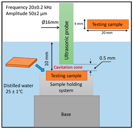 The cavitation erosion test was conducted using the ultrasonic vibration method with a stationary sample, following the ASTM G-32-16 standard [40]. The cavitation setup, together with its relevant characteristics, is shown in Figure 1. The test conditions were as follows: frequency of 20 ± 2 kHz, amplitude 50 ± 2 µm, a diameter of the probe of 16 mm, and a distance of 0.5 mm from the probe to the sample. Distilled water was used at a temperature of 25 ± 1 °C. The sample dimensions were 20 mm in width and 4 mm in height, with its geometry (cuboid), also illustrated in Figure 1. Cavitation testing was performed in intervals of 10 and 30 min, for a total testing duration of 150 min.