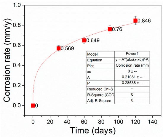 Calculated results for various test durations of corrosion rate are presented in Figure 3. Generally, as the exposure time increases, the corrosion rate of the specimens also rises. The initial corrosion rate is high, leading to aggressive corrosion as chloride ions accelerate dissolution. Over time, as corrosion continues, the rate gradually decreases. This decrease is likely due to the formation of corrosion products, such as iron oxides and hydroxides, on the metal surface. More precisely, these products partially block active sites, creating a barrier to further ion exchange, which makes the surface less reactive and slows down the corrosion process. The slope of the curve indicates that corrosion accelerates up to 30 days of testing, after which the rate slightly slows down until 120 days. The average corrosion rate of 42CrMo4 steel in a 3.5% NaCl solution exhibits a power law increase over time, peaking at 0.846 mm/year after 120 days of exposure to the solution.