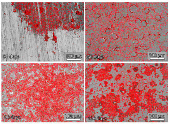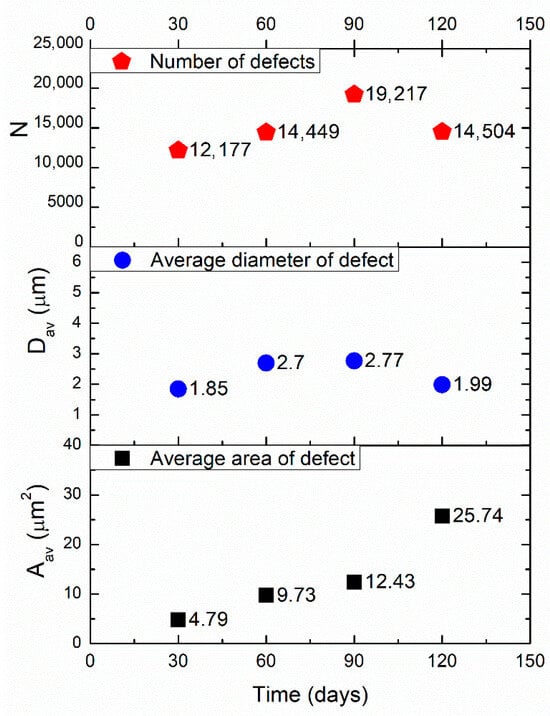 The results confirm that corrosion leads to the formation of defects, increasing their area, diameter, and number over time. However, the mechanisms of defect formation and growth change during the testing period. Up to 90 days, the number of induced defects, along with their average areas and diameters, increases, indicating that both existing and newly formed defects are growing and merging because the obtained results of the average area of the formed defects are consistent with the number of defects. After 90 days of corrosion exposure, the formation of new defects is no longer the dominant mechanism, as the number of new defects decreases. This indicates that the merging of existing defects becomes predominant. Up to 90 days, the trends in average defect area and average defect diameter are similar. However, changes occur after this period, indicating that the average area of defects increases while the average diameter decreases. This suggests that there are changes in the shape or distribution of the defects, transitioning from more circular defects to more irregularly shaped ones that cover a larger area. This change may occur if the corrosion mechanism changes, leading to a finer and more distributed degradation pattern. More precisely, since the average diameter refers to the size of the defects, a decrease in that value together with an increase in the average area may indicate that the defects are no longer circular but are becoming more irregular in shape. The irregular shape of defects can result in larger surface areas, even with smaller average diameters, as their elongated or more complex shapes spread out over a larger area. Corrosion often leads to non-uniform surface degradation, so as it progresses, defects may spread over a larger area due to the surface roughening effect, increasing the overall defect area.