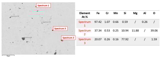 Figure 6 presents the SEM image and the elemental composition (derived from marked spots, Spectra 1–3) of 42CrMo4 steel on day zero, before exposure to corrosive media. According to SEM is obvious that this microstructure is smooth and uniform with minimal defects. The elemental composition obtained from the EDS analysis of the matrix region (Spectrum 1) is closely matched with the chemical composition shown in Table 1, containing a very high level of Fe (97.42 at.%), suggesting the presence of a ferrite microstructure as a major constituent, with small amounts of Cr, Mn, Si, and Al. Based on the microscopic analysis of the sample before testing, the microstructure after hot rolling is ferritic-pearlitic, with ferrite as the predominant microconstituent. Typically, the microstructure of 42CrMo4 steel after hot rolling consists of a ferrite-pearlitic structure, although variations may occur depending on the rolling temperature and subsequent cooling conditions [41,42,43]. However, there is a noticeable absence of molybdenum and reduced levels of impurities, which can be explained by the absence of exposure to the corrosive solution at this stage. EDS analysis (Spectrum 2) shows a significantly lower content of Fe (37.34 at.%), along with notable amounts of Mg (11.88 at.%) and Si (10.94 at.%). The presence of oxygen (39.06 at.%) indicates the existence of an oxide non-metallic inclusion, most likely a Mg-Si-O inclusion, possibly a spinel-type such as MgO·SiO2 or a silicate [44,45,46]. It can be assumed that magnesium appears in the steel structure due to contamination during sample preparation or the use as a deoxidizer or desulfurizer in steelmaking processes. The contents of Fe (20.07 at.%) and Si (77.92 at.%) detected in Spectrum 3 probably come from the deoxidizer FeSi or as a residual element found in certain raw materials or alloying elements during the steelmaking process.