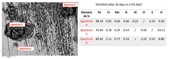 Figure 7 presents SEM images and the elemental composition (marked spots, Spectra 4–6) of the 42CrMo4 steel after 30 days of exposure to a corrosive NaCl solution. SEM reveals corrosion initiation and early-stage oxidation, with small corroded areas, localized pits, and deposits forming on the surface. Compared to the initial compositions (Table 1 and Table in Figure 6), the EDS results after the first cycle of exposure to the corrosive media show a composition similar to that observed in the initial analyses, particularly in Spectra 4 and 6. However, low levels of impurities, such as sulfur and chlorine, were detected in the structure, likely originating from the saline solution due to corrosion effects. Elemental analyses (Spectra 4 and 6) reveal dominant Fe regions (88.18 at.% and 85.62 at.%), indicating a relatively uncorroded matrix, most probably ferrite, with minimal areas of corrosion and the presence of small amounts of Cr, Mn, and Si. A slightly increased level of Cr (2.11 at.%) detected in Spectrum 6 suggests that it contributes to some corrosion resistance by forming a protective layer. The contents of O in both Spectra indicate the presence of oxide, while the low amounts of S suggest the formation of sulfide deposits. Additionally, Spectrum 6 shows the presence of Cl (2.22 at.%), suggesting the formation of chlorides and thus a partially corroded region. However, most of the steel surface remains mostly uncorroded. Unlike the previous two spectra, Spectrum 5 indicates the occurrence of corrosion. The contents of both Fe (35.69 at.%) and O (63.11 at.%) suggest the presence of Fe oxides, hydroxides, and oxyhydroxides (FeO, Fe2O3, Fe3O4, FeOOH), which are products of iron corrosion. In addition, the presence of Cl (0.59 at.%) indicates that a chloride attack occurred, probably resulting in the formation of FeCl2, FeCl3, or iron oxychloride-type compounds [47,48].