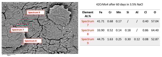 Figure 8 presents the SEM image and elemental composition (marked spots, Spectra 7–9) of 42CrMo4 steel after 60 days of exposure to a corrosive medium. Visual inspection indicates that the steel surface is heavily corroded and cracked, accompanied by thick corrosion products at the surface. Additionally, corrosion deepens, showing detachment of corrosion products. Such a pattern may indicate the occurrence of stress corrosion cracking. All three analyzed spectra exhibit a similar elemental composition and show the presence of a thick, corroded, and oxidized layer, particularly in Spectra 7 and 9. Elemental analyses of Spectra 7 and 9 reveal reduced amounts of Fe (41.71 at.% and 44.75 at.%, respectively) and elevated contents of O (57.04 at.% and 52.87 at.%, respectively) compared to their initial contents (Figure 6). This composition indicates predominant oxidation during this period and the formation of a thick layer of Fe oxides, hydroxides, and oxyhidroxides. The contents of Cr in both Spectra are slightly higher (0.68 at.%) and significantly higher (1.63 at.%), respectively, than what was determined in the initial composition (Table 1), which contributes to localized passivization and slows further corrosion. Notably, Cl appears in trace amounts (0.40 at.% and 0.08 at.%) due to exposure to the saline environment, suggesting some chloride-induced attack. This indicates the presence of chloride particles incorporated into the corroded layer, even in Spectrum 9. Elemental analysis (Spectrum 8) shows a more extensive corrosion zone than that detected in Spectra 7 and 9. This can be attributed to a lower content of Fe (33.90 at.%) and a higher content of O (64.40 at.%), indicating intensive oxidation. Additionally, the content of Cl (0.86 at.%) is also higher, suggesting the presence of chlorides or oxychlorides [47,48]. This area of the micrograph can be considered the most damaged, as chlorine-induced corrosion has significantly degraded the steel surface and penetrated to a greater depth.