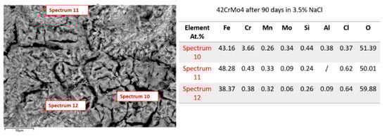 Figure 9 presents the SEM images and elemental composition (marked spots, Spectra 10–12) of 42CrMo4 steel after 90 days of exposure to corrosive media. Compared to the initial chemical and elemental compositions (Table 1 and Figure 6), the contents of Fe and O show lower levels, while molybdenum has been detected for the first time, with small levels of impurities such as Mn, Si, and Al. Notably, chlorine levels increased significantly, reflecting the impact of saline solution exposure. The results reveal serious surface degradation with deep cracks and confirm the formation of corrosion products. Microstructural observation of the SEM image reveals a highly cracked and porous surface, an extensive layer of oxide, and evident spalling of corrosion products. The pattern of cracks and pores suggests that the oxide layer is non-protective and prone to further corrosion, allowing the penetration of Cl. EDS analyses of Spectra 11 and 12 reveal a highly oxidized region, most likely composed of ferous oxides, hydroxides and oxyhydroxides. This is indicated by the contents of Fe (48.28 at.% and 38.37 at.%, respectively), which is lower than that of the uncorroded composition, and the contents of O (50.01 at.% and 59.88 at.%), which is higher than that of the uncorroded composition. These contents confirm significant metal loss and heavy oxidation. Additionally, the presence of Cl (0.62 at.% and 0.64 at.%, respectively) suggests a strong chloride-induced corrosion attack. The significant amount of Cr (3.66 at.%, Spectrum 10) and a noticeable amount of Mo (0.34 at.%) may indicate the potential formation of protective chromium oxides and molybdate compounds, which can act as corrosion inhibitors [49,50,51]. The presence of Cl suggests some chloride attack, while the presence of Cr and Mo indicates the formation of a protective passive layer, which enhances corrosion resistance.