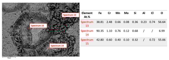 Figure 10 shows the SEM image and elemental composition (marked spots, Spectra 13–15) of 42CrMo4 steel after 120 days of exposure to a saline environment. Microstructural observations of the SEM micrograph show severe corrosion on the sample surface, characterized by areas of cracking, porosity, and corrosion deposits. Cracks and pits are particularly evident in Spectra 13 and 15. It is clear that multiple corrosion phases are present, including Fe oxides, hydroxides, and chloride-containing compounds. EDS analysis of Spectrum 13 reveals a severely corroded region with Fe at 38.81 at.%, indicating significant material loss due to corrosion, and O at 56.64 at.%, confirming extensive oxidation (iron oxides/hydroxides). The presence of Cl at 0.74 at.% suggests chloride-induced corrosion and the formation of FeCl2/FeCl3 [47,48]. Spectrum 14 indicates the presence of less corroded base material, with Fe content at 90.35 at.% and O at 6.99 at.%, suggesting minimal corrosion and largely unoxidized material. The low levels of Cr and Mo indicate less extensive passive layer formation. Elemental analysis of Spectrum 15 indicates a moderately corroded region, with the content of Fe (42.80 at.%) that is rather reduced, indicating corrosion progression and the high content of O (55.06 at.%) confirms oxidation. The content of Cl (0.72 at.%) suggests continued chloride-induced attack, indicating progressive but non-uniform corrosion.