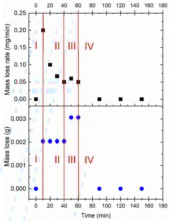 According to the most commonly used method for displaying results related to monitoring degradation progression caused by cavitation, mass loss (ML) and mass loss rate (MLR) are utilized, while the obtained results are presented in Figure 11. Different periods of cavitation are marked. The incubation period (I) is very short, indicating the initial formation of cavitation pits, when the sample is most sensitive to pit formation, and the energy required for pit formation is rather low. The accumulation period (II) lasts 30 min (from 10 to 40 min) and represents more pronounced material removal and intensified cavitation degradation progress. It can be assumed that during this period, plastic deformation begins, leading to micro-pitting and material weakening, which in turn results in increased erosion and fatigue damage. The following period, lasting 20 min (from 40 to 60), is called the attenuation period. This phase is characterized by the highest mass loss and a steady, severe material loss, while the cavitation process is fully developed, reaching a plateau and stabilization. The steady-state period begins after 60 min, marked by a sharp decline in mass loss rate. Since the exposure time continues up to 150 min, further experiments will provide the results for the duration of this period.