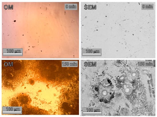 The appearance of the sample surface before and during cavitation erosion testing obtained using OM and SEM.