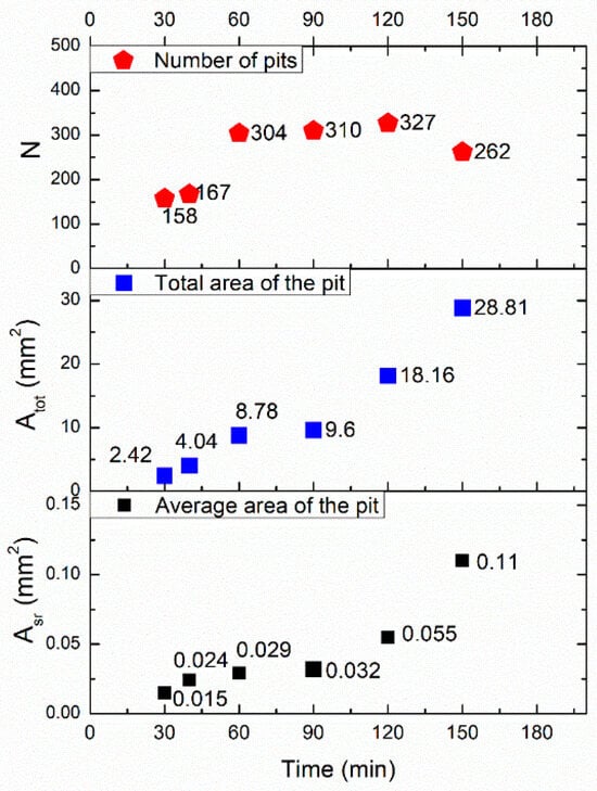 Based on the image analysis and the program for the morphological characterization of induced defects (Image Pro Plus), selected parameters, such as the average diameter of the pits, the total area of the pits, and the number of formed pits, were determined, and the obtained results are presented in Figure 13. These parameters were chosen because they can quantify the degradation level through the total area of formed pits. Additionally, the obtained values of these selected parameters can help determine the degradation mechanism. Specifically, the number of formed pits and their relation to exposure time, along with the total and average area of pits, can indicate which mechanism is dominant during a specific period of cavitation erosion. This may reveal whether the process involves pit formation, pit growth, or the merging of already formed pits into larger ones.