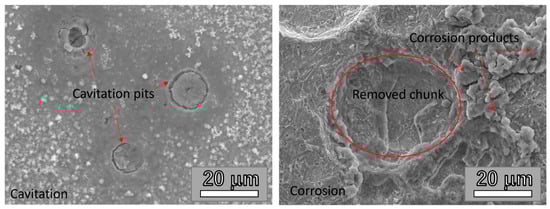 Microscopic analyses of the damage (SEM) that occurs due to cavitation and corrosion reveal differences in the morphology of the damage, as clearly demonstrated in Figure 15. In the case of corrosion, mass loss occurs due to chemical and/or electrochemical reactions between the metal and the environment, leading to the formation of corrosion products and their detachment, as shown in Figure 15. On the other hand, for the samples exposed to cavitation, mass loss results from mechanical damage caused by the collapse of cavitation bubbles, which leads to surface fatigue, local pressure, material erosion, and the appearance of pits and cavities. After corrosion in a 3.5% NaCl solution, the mass loss is approximately linear over time; however, no extensive protective layer is formed on the surface of the tested samples. Steel 42CrMo4 is an alloyed steel that contains chromium (Cr) and molybdenum (Mo), which provide certain corrosion resistance properties, but it is not fully passivated under all conditions. When 42CrMo4 steel is exposed to corrosion in the NaCl solution, it does not form a stable passive layer as some other alloyed steels do, such as stainless steel (e.g., types 304 or 316), which passivate in the presence of chromium oxides. In NaCl solutions, 42CrMo4 steel is susceptible to corrosion, as NaCl can cause pitting (localized corrosion) and other types of surface damage. Although the tested steel contains chromium and molybdenum, which provide some level of corrosion resistance, this resistance is insufficient to passivate the steel in the aggressive conditions of NaCl solutions. After exposure to a cavitation environment, mass loss exhibits an incubation period characterized by minimal mass loss, followed by a phase of accelerated damage and eventual stabilization. Corrosion damage typically shows rough surfaces with visible corrosion products, whereas cavitation damage presents pits, depressions, and characteristic pitting structures resulting from localized mechanical impacts (Figure 15).