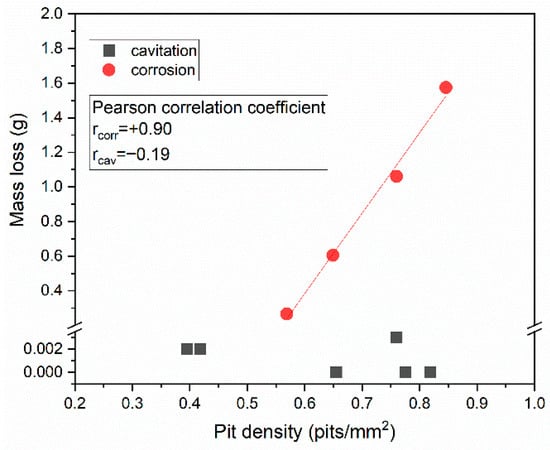 Statistical analysis of the correlation between mass loss and pit density, resulting from corrosion and cavitation exposure, is shown in Figure 16.