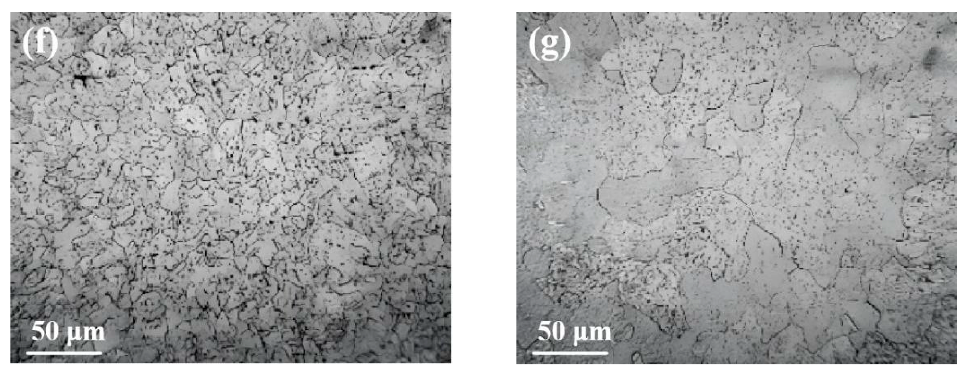 - The annealing response of the rolled process markedly outperformed that of rotary forging. Following annealing at 2300 °C, the rolled ø9.0 mm bar exhibited a grain count of 2196 per/mm2, surpassing the rotary forged sample’s 1900 per/mm2. After annealing, the grain size distribution became more uniform, with significantly enhanced microstructural compactness. For ø5.2 mm bars annealed at 2300 °C, the rolled grain size reached 2350 per/mm2, meeting the ideal range (2000–2500 per/mm2) for subsequent wire drawing. In contrast, the rotary forging process yielded only 2246 per/mm2, demonstrating superior microstructural controllability of the rolling process after annealing.