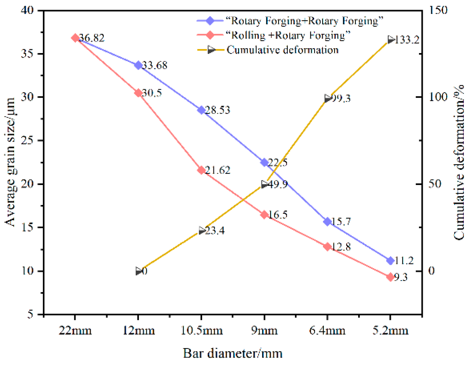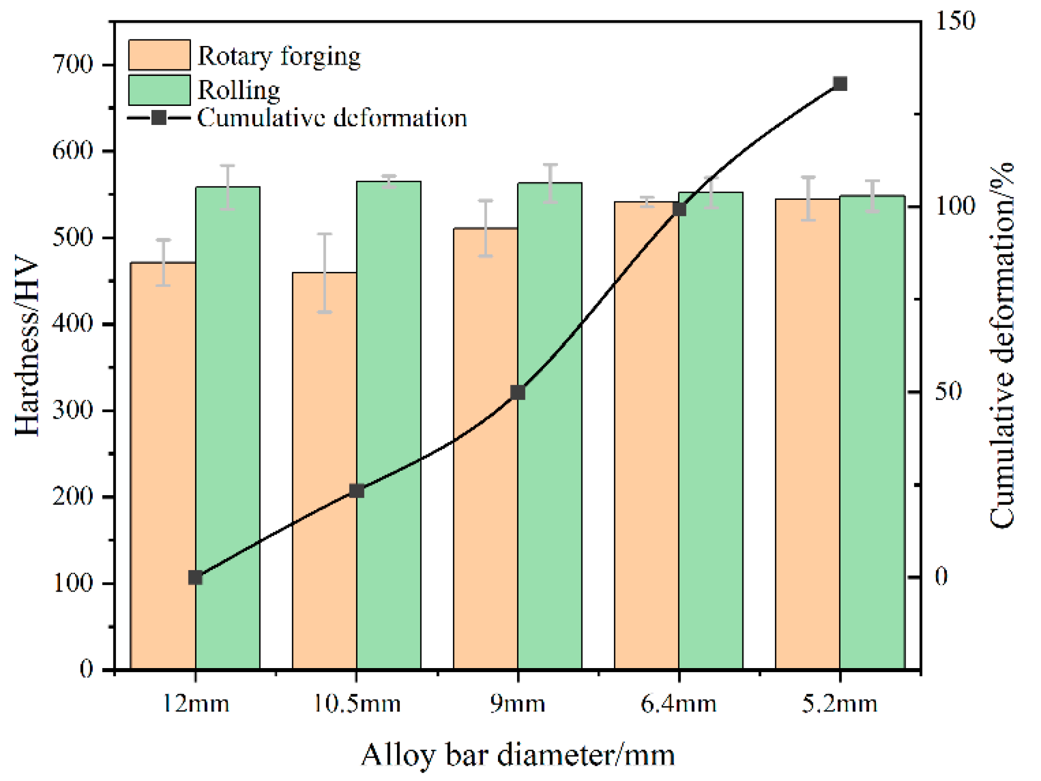 - The hardness of hot-rolled material was significantly higher than that of rotary forging. At the ø5.2 mm diameter stage, hot rolling yielded a hardness of 548.4 HV, whereas rotary forging produced 544.9 HV. Hot rolling substantially enhanced the material’s comprehensive properties through uniform deformation and dynamic recrystallization mechanisms.