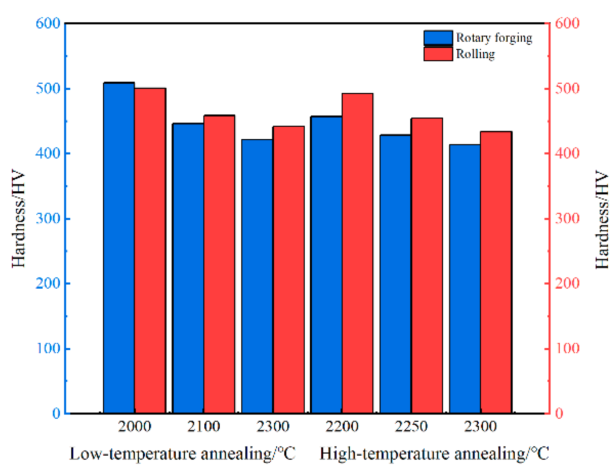 3.3. Hardness Distribution of W-La Alloy Under Rotary Forging and Rolling Processing