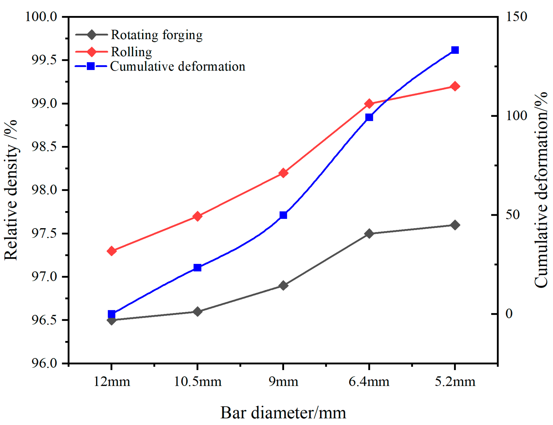 | Bar Diameter (mm) | Processing Method | Compression Ratio (%) | Density (g/cm3) | Relative Density (%) |