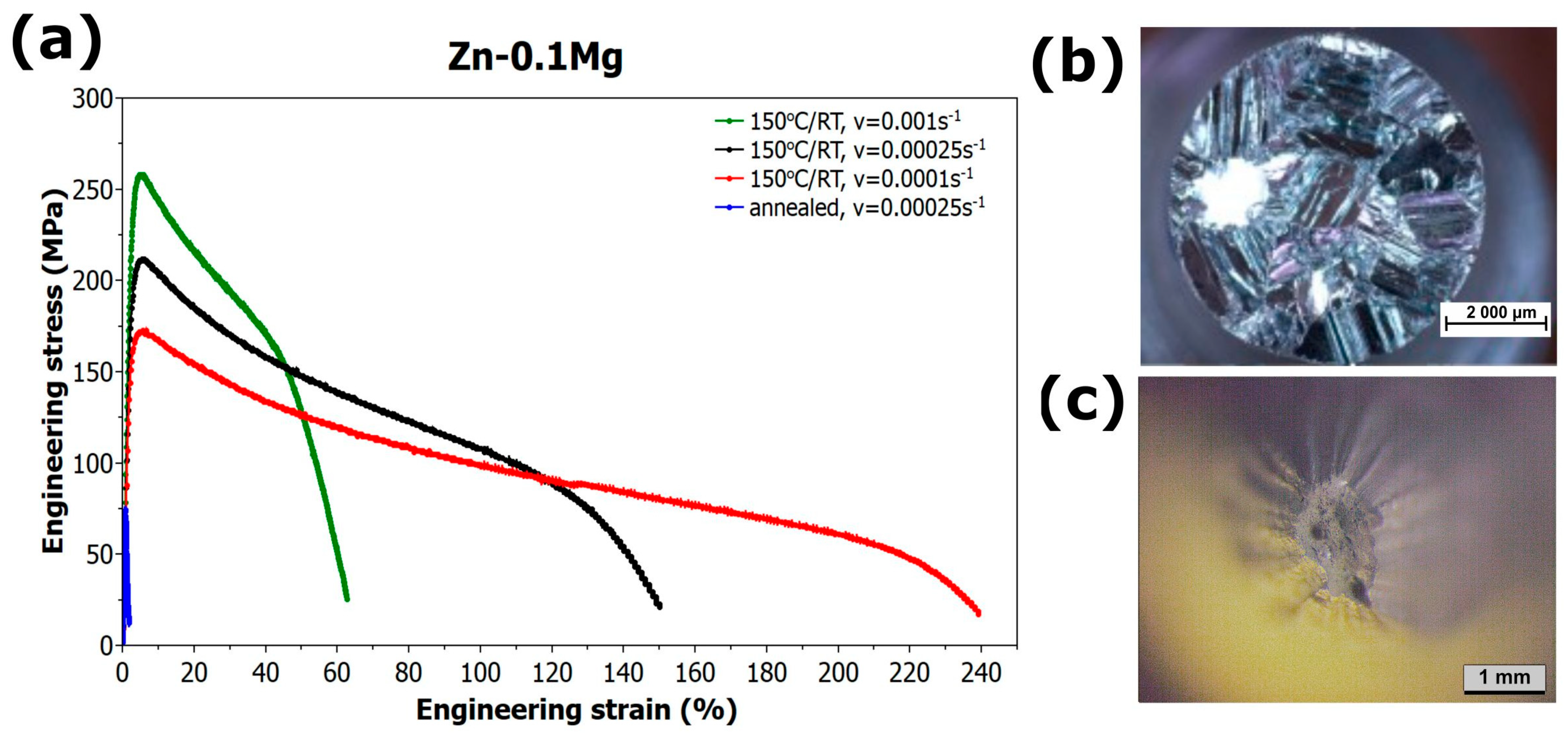 - Guo, P.; Li, F.; Yang, L.; Bagheri, R.; Zhang, Q.; Li, B.Q.; Cho, K.; Song, Z.; Sun, W.; Liu, H. Ultra-Fine-Grained Zn-0.5Mn Alloy Processed by Multi-Pass Hot Extrusion: Grain Refinement Mechanism and Room-Temperature Superplasticity. Mater. Sci. Eng. A 2019, 748, 262–266. [Google Scholar] [CrossRef]