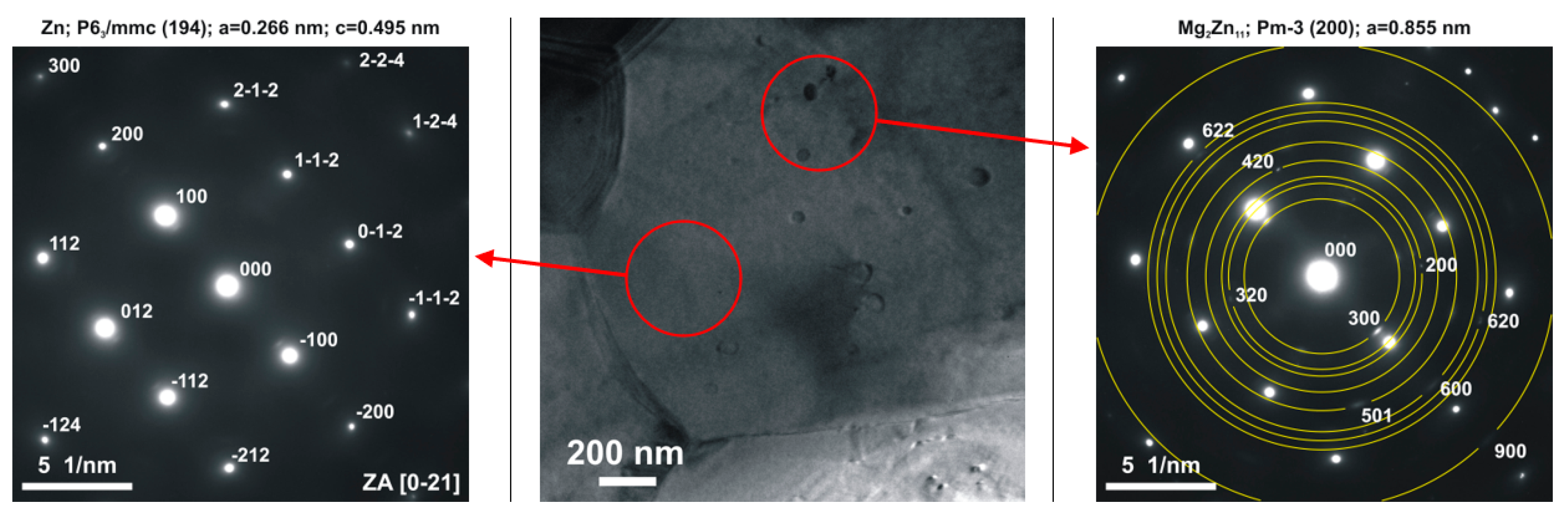 - Transmission (Debye-Scherrer) X-ray diffraction using high-energy synchrotron radiation confirmed the presence of the hcp supersaturated Zn solid solution together with minor intermetallic phases Mg2Zn11 and possibly also MgZn2. No transformation of the matrix hcp-Zn phase (space group P63/mmc, No. 194) was detected under severe deformation.