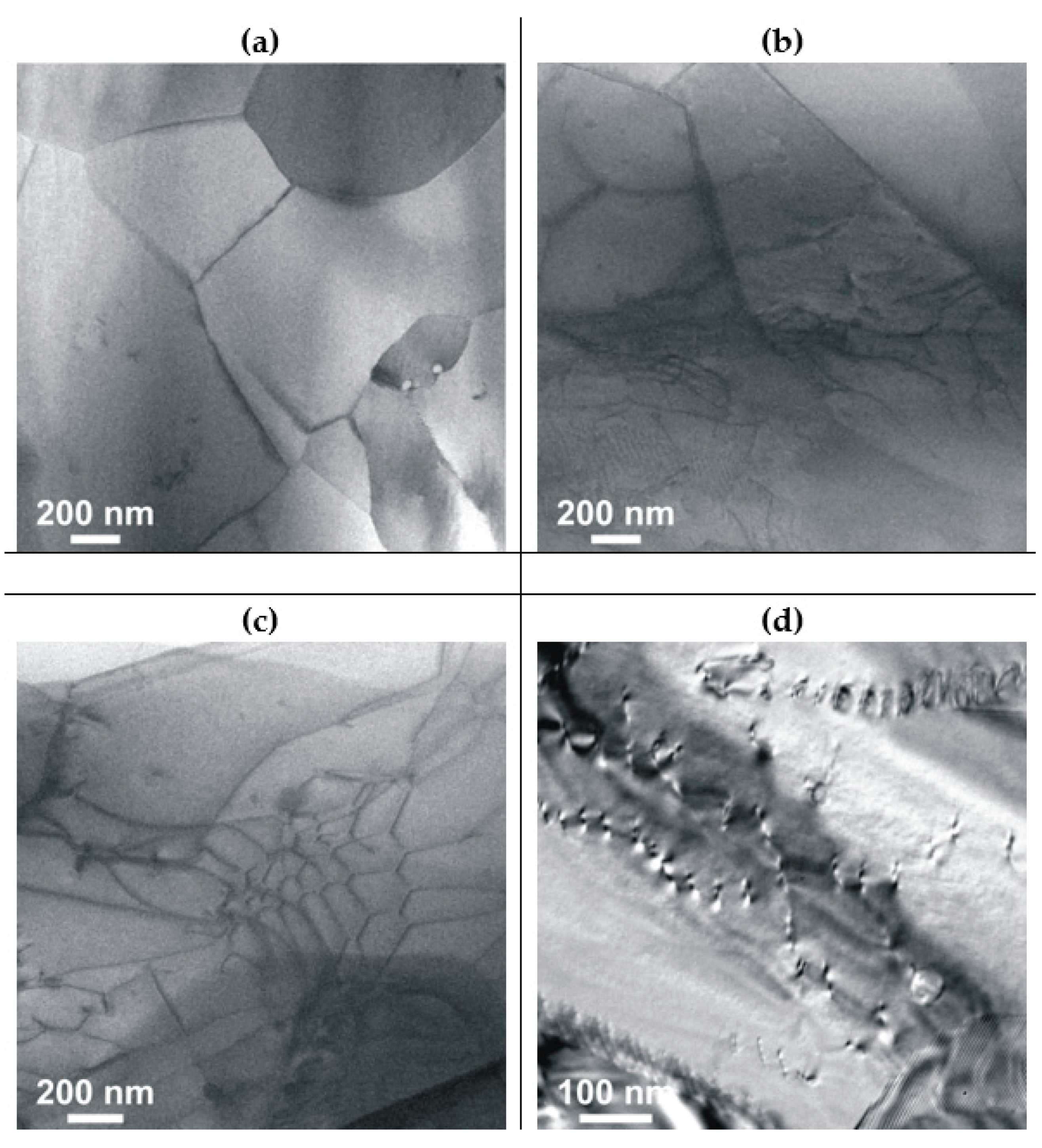 - The ECAP-processed alloy exhibits an ultrafine microstructure with TEM grain size ≈ 0.5–1.0 μm. The XRD line-profile-derived domain (‘crystallite’) size is ≈1 μm and remains unchanged within uncertainty before vs. after tensile testing. Thus, the microstructural refinement is attributed to ECAP, not to the subsequent tensile deformation.