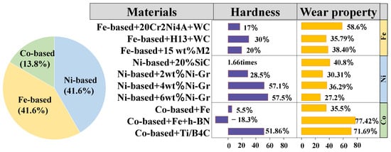 The selection of laser cladding materials serves as the primary determinant of both the microstructure and properties of the cladding layer. Iron-based, nickel-based, and cobalt-based self-fluxing alloys, representing the most prevalent types of alloy materials, find extensive application in this field. The performance optimization of these fundamental alloy systems primarily revolves around two core strategies. The first involves the incorporation of high-hardness reinforcing particles, such as tungsten carbide (WC) and titanium carbide (TiC), which aim to significantly enhance the hardness, wear resistance, and corrosion resistance of the clad layer. The second strategy employs powder mixing technology to introduce additional alloying elements or compounds. This approach modifies the metallurgical reactions and solidification behavior within the melt pool, thereby refining the microstructure of the clad layer, reducing crack susceptibility, and achieving a synergistic improvement in both strength and toughness. As shown in Figure 6, this section summarizes several major materials and their performance improvement data.