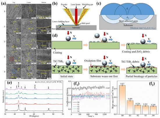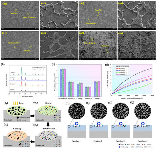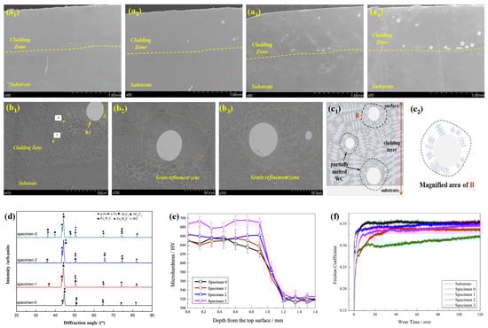 (a1–a4) Cross-sectional morphologies of Fe-based coatings with different WC content, (b1–b3) typical SEM images of different regions, (c1,c2) influence mechanism of WC particles on the microstructural evolution, (d) XRD spectra for four types of Fe-based coatings, (e) in-depth microhardness distributions, (f) friction coefficient curves. Reprinted with permission from ref. [95].