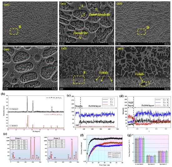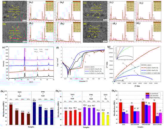 Typical SEM images of four Fe-based coatings and EDS results of corresponding elements (a) X431, (b) X431 + 8 wt% Ni45, (c) F901 + 8 wt% Ni45, (d) X431 + 1.5 wt% Mo, (a1–d2): respectively corresponding to (a–d) in (1,2) element energy spectrum (EDS) analysis results. (e) XRD pattern analysis of four Fe-based coatings, (f) potentiodynamic polarization curves of four Fe-based coatings immersed in 3.5 wt. % NaCl solution at room temperature, (g) typical Nyquist plots of four Fe-based coatings immersed in 3.5 wt. % NaCl solution at room temperature, (h1) two Fe-based coatings+Ni45, (h2) two Fe-based coatings +Ni45/Mo, (h3) four Fe-based coatings under different heat treatment conditions. Reprinted with permission from ref. [100].