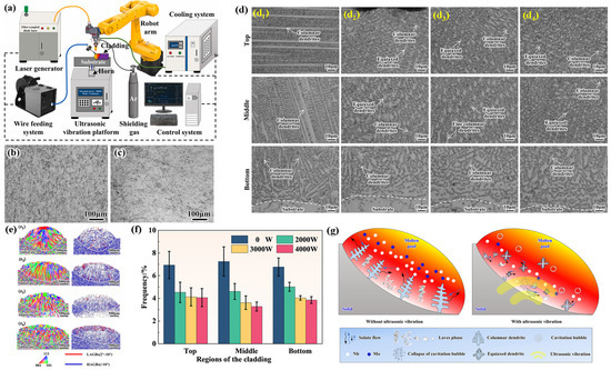- Chen, J.; Yao, Z.; Wang, F.; Chi, Y.; Wang, Z.; Tofil, S.; Yao, J. Grain refinement and Laves phase dispersion by high-intensity ultrasonic vibration in laser cladding of Inconel 718. J. Mater. Res. Technol.-JmrT 2024, 30, 8563–8575. [Google Scholar] [CrossRef]