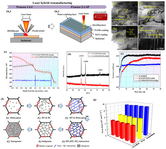 - Lu, H.; Xue, K.; Xu, X.; Luo, K.; Xing, F.; Yao, J.; Lu, J. Effects of laser shock peening on microstructural evolution and wear property of laser hybrid remanufactured Ni25/Fe104 coating on H13 tool steel. J. Mater. Process. Technol. 2021, 291, 117016. [Google Scholar] [CrossRef]
