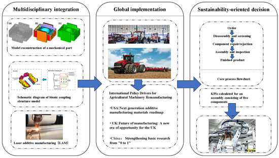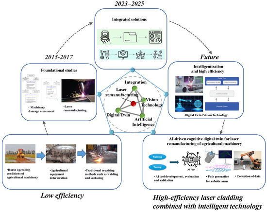 Laser-based remanufacturing is an integrated process comprising multiple interrelated sub-processes. At its core lies the laser cladding remanufacturing (LCR) process, which is inherently complex due to the multitude of influencing parameters, rendering the optimization of processing conditions and control of material systems particularly challenging [12,13]. Effective LCR implementation requires comprehensive consideration of substrate properties and the synergistic effects of auxiliary energy fields. Without such considerations, even successful geometric restoration may result in substantial performance degradation. The primary objective of this work is to present a timely and focused review of the end-to-end remanufacturing process for agricultural machinery and equipment, encompassing damage assessment methodologies, inspection techniques, material selection criteria, remanufacturing procedures, and post-processing validation. This critical review aims to provide researchers and practitioners with comprehensive, state-of-the-art insights into LCR, facilitating the identification of current strengths and limitations when applied to agricultural machinery. Furthermore, it seeks to accelerate the maturation and enhancement of technology readiness levels, thereby promoting the transition of LCR technologies from laboratory-scale research to industrial-scale applications.