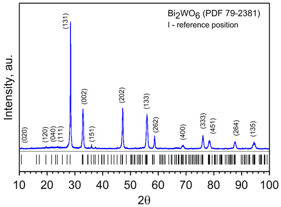 The results are presented in Figure 1. The lattice parameters of Bi2WO6 were determined by Rietveld refinement using software GSAS II version 5800 (Argonne National Laboratory, Lemont, IL, USA) [40]. The pseudo-Voigt peak shape function was adopted. The short vertical markers represent the peak positions from [41] database. The parameters of oxygen atoms are difficult to refine because of their small scattering factors [18]. The lattice constants of Bi2WO6 structure are as follows: a = 5.43391(1) Å, b = 16.42596(2) Å, c = 5.45620(1) Å, (Z = 4, V = 487.005 Å3), which proved that this product is orthorhombic. The lattice parameters of powder material were found to be similar with these reported in JCPDS card no. 01-079-2381. The obtained structure of the low-temperature polar (orthorhombic) phase of russellite agrees very well with the literature data of Knight [17] with powder neutron diffraction and Okudera et al. [20] with the Weissenberg method: 5.43726; 16.43018; 5.45842 (code ID 9011799) and 5.4345; 16.4324; 5.4558 (code ID 2108252), respectively [35]. No impurity lines from pure binary oxides or any other impurities were observed in the XRD spectrum of Bi2WO6.