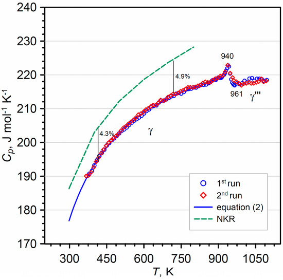At high temperatures, the dominating effects such as lattice anharmonicity and expansion effects are described by the linear term in Equation (1). The quadratic term is required in many cases to describe the nonlinear behavior of the Cp(T) dependences close to the melting point. In the present analysis, Equation (1) was fitted with three and four terms, respectively, defined by a, b, c, d parameters (Figure 3) depending on the temperature range. The part of temperature dependence of heat capacity below the second-order transformation has been described by four terms Equation (2). In the case of detected phase transitions, the excess heat capacity ΔexCp related to this phase transition can be determined by subtracting the measured heat capacity values [45] and the heat capacity derived from the modeled line of the Cp = f(T) for both γ and γ‴ phases.