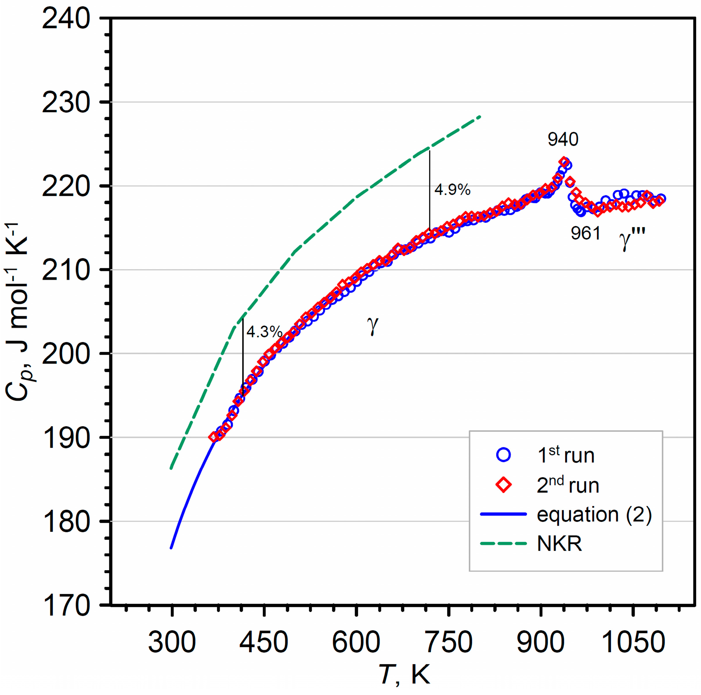 The heat capacity of pure phases in the high-temperature range (T ≥ 298.15 K) listed in the reviews are the outcomes of various preliminary fitting and smoothing procedures for enthalpies, H(T), and the respective heat capacities, Cp(T) = (dH(T)/dT)p. Instead of real experimental values, these Cp(T) values are based on relatively simple analytical expressions. For example, the well-known Maier–Kelley [32] equation is adopted: