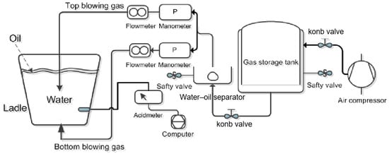 In order to clarify the effect of top and bottom blowing on the stirring of steel liquid and the improvement in steel slag, a reasonable blowing system and pre-slag mode are formulated based on this. Industrial experiments were conducted to achieve the goal of fully stirring the steel liquid, effectively improving the quality of steel slag and promoting early slag formation. A physical model with a geometric similarity ratio of 1:5.75 was established based on a 300t ladle in a certain factory. Water was used to simulate the flow characteristics of molten steel, oil was used to simulate slag, and compressed air was used to simulate Ar gas [13,14,15]. This study provides a theoretical basis for optimizing the flow field of the ladle and improving its cleanliness. This study uses a cold physical model to measure the mixing time by changing the bottom blowing gas supply flow rate, top gun gas supply flow rate, and top gun insertion depth. The corresponding mass transfer coefficient is calculated to reflect the blowing process conditions when different parameters are selected, providing a theoretical basis for establishing a reasonable process system. Figure 1 shows the experimental principle diagram of the physical simulation. Table 1 shows the relevant comparative parameters between the prototype and model of the ladle.