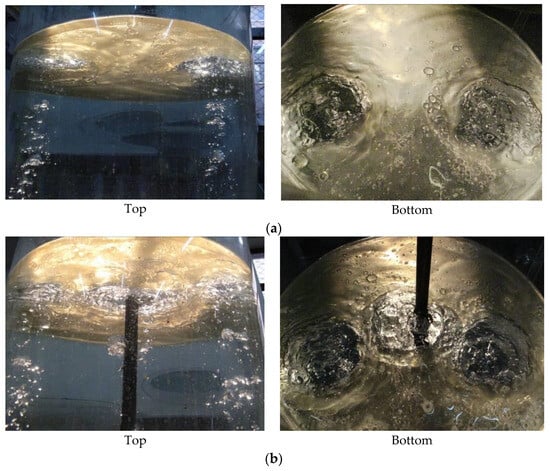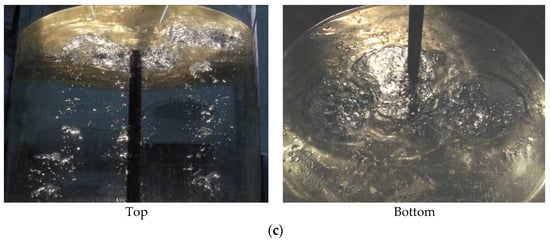 Physical simulation test effect diagram: (a) Top: 0 Nm3·h−1; Bottom: 0.39 Nm3·h−1. (b) Top: 0.28 Nm3·h−1; Bottom 0.39 Nm3·h−1. (c) Top: 0.39 Nm3·h−1; Bottom: 0.39 Nm3·h−1.