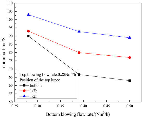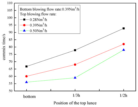 The mixing time represents the stirring effect of the top and bottom blowing of the ladle, and the shorter the mixing time, the better the stirring effect of the blowing on the molten steel. Figure 3 shows the effect of different top gun positions on mixing time while keeping the bottom blowing flow rate constant. When the bottom blowing flow rate remains constant, the mixing time of the solution is the shortest when the top gun is located at the bottom of the model, with a minimum mixing time of 56 s. Gradually increasing the position of the top gun from the bottom of the model to the height of 1/2 h of the model increases the mixing time of the solution by more than 20 s. At the same top gun position, the larger the top blowing flow rate, the shorter the mixing time. Figure 4 shows the effect of different bottom blowing flow rates on mixing time while keeping the top blowing flow rate constant. When the top blowing flow rate remains constant, the mixing time of the solution decreases with the increase in the bottom blowing flow rate. Increasing the bottom blowing flow rate from 0.28 Nm3·h−1 to 0.5 Nm3·h−1 reduces the mixing time by more than 12.6%. Here, the most significant reduction in mixing time is when the top gun is located at the bottom of the model, about 27%. As can be seen from the above, the mixing time inside the ladle gradually decreases with the increase in bottom and top blowing flow rates. When the top blowing position is at the bottom of the model, the mixing time is the smallest and the stirring efficiency is the highest.
