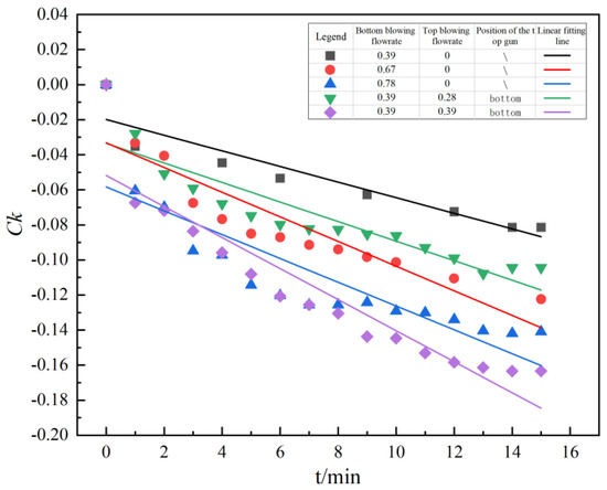 From the above analysis, it can be concluded that the mixing time is shortest when the flow rate remains constant and the top gun is located at the bottom of the model. On this basis, experiments were conducted to determine the concentration of benzoic acid under different gas supply flow rates, as shown in Figure 5. Figure 5 shows the variation in Ck over time under different gas supply flow rates; the concentration of benzoic acid in water is basically linearly related to the gas supply time. Without top blowing, when the bottom blowing flow rate is 0.39 Nm3·h−1, the mass transfer rate ka = 0.735 × 10−4 s−1; when the bottom blowing flow rate is 0.670 Nm3·h−1, the mass transfer rate ka = 0.925 × 10−4 s−1; and when the bottom blowing flow rate is 0.78 Nm3·h−1, the mass transfer rate ka = 1.17 × 10−4 s−1. As the bottom blowing flow rate increases, the mass transfer rate gradually increases. When the bottom blowing flow rate remains unchanged at 0.39 Nm3·h−1 and the top blowing flow rate is 0.28 Nm3·h−1, the mass transfer rate ka = 1.17 × 10−4 s−1. When the top blowing flow rate increases to 0.39 Nm3·h−1, the mass transfer rate ka = 1.43 × 10−4 s−1. An increase in top blowing flow rate will also improve mass transfer speed.