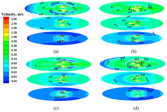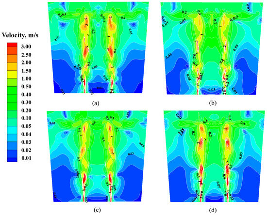Velocity distribution diagram of cross-sectional flow field in ladle blowing: (a) no top blowing, (b) top blowing height h1 = 300 mm, (c) top blowing height h2 = 1110 mm, and (d) top blowing height h3 = 1665 mm.