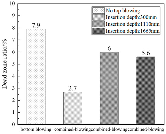 Firstly, the area where the steel flow velocity v < 0.02 m/s is defined as the flow dead zone. Figure 6 shows the distribution of longitudinal cross-sections of the velocity flow field inside the ladle under four different argon blowing modes. As shown in the figure, the four zones of molten steel in the ladle are mainly located at the bottom of the ladle. In the absence of top blowing, the area of the dead zone is the largest. In the case of top and bottom blowing, the area of the dead zone at the bottom of the ladle gradually decreases with the downward movement of the top blowing position. Figure 7 summarizes the proportion of dead zones in four different scenarios. In the case of only bottom blowing, the dead zone ratio is 7.9%. When the top blowing distance from the bottom is 300, 1110, and 1665 mm, respectively, the dead zone ratio is 2.7%, 6.0%, and 5.6%. Compared with pure bottom blowing, the dead zone ratio is significantly reduced under repeated blowing conditions, especially when the top blowing insertion depth is 300 mm. The top and bottom blowing of the ladle can fully stir the molten steel, reduce the proportion of dead zones, and facilitate the floating of inclusions and mass transfer between steel slag.