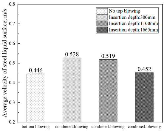 Figure 8 shows the cross-sectional distribution of the velocity flow field inside the ladle under four different argon blowing modes. The cross-sectional velocity distribution cloud maps at distances of 1 m, 2 m, and 3 m from the bottom are listed in the figure. It can be clearly compared that the steel flow velocity in the ladle under pure bottom blowing is lower than that under top and bottom blowing, and the maximum steel flow velocity is observed at the top blowing position h1 = 300 mm. Figure 9 summarizes the average flow velocity of the ladle liquid level under four modes. Under the same bottom blowing flow rate, the average liquid surface velocity in the top–bottom combined blowing mode is higher than that in the pure bottom blowing mode, and the average liquid surface velocity gradually increases as the insertion position decreases, reaching its maximum when the top blowing insertion depth is 300 mm.