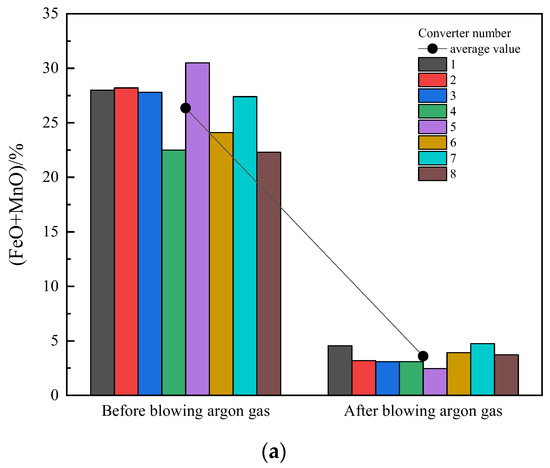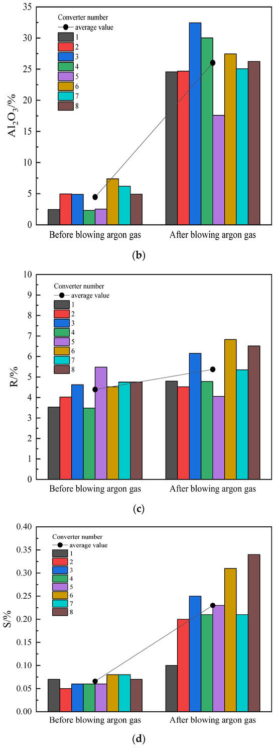 Figure 10 shows the composition change of slag before and after ladle refining. It can be seen that after the top and bottom composite blowing of the ladle, the average content of (FeO + MnO) in the slag decreased from 26.38% to 3.48%; the average content of Al2O3 in the slag increased from 5.12% to 26.01%; the average alkalinity (R) of the slag increased from 4.38 to 5.35; and the average sulfur content of the slag increased from 0.07% to 0.23%.