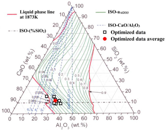 The composition of refined slag is crucial for the removal of inclusions, and the CaO/Al2O3 ratio of refined slag should be less than 2.0 [20,21,22,23]. The ternary phase diagram of the CaO-Al2O3-SiO2 slag system was obtained through thermodynamic calculations using Factstage, as shown in Figure 11. After the top and bottom composite blowing of the ladle, the slag composition is shown in the figure. It can be seen that the average content of CaO/Al2O3 in the slag decreases to 2, and the slag is completely dispersed into the liquid phase zone except for the fifth furnace.