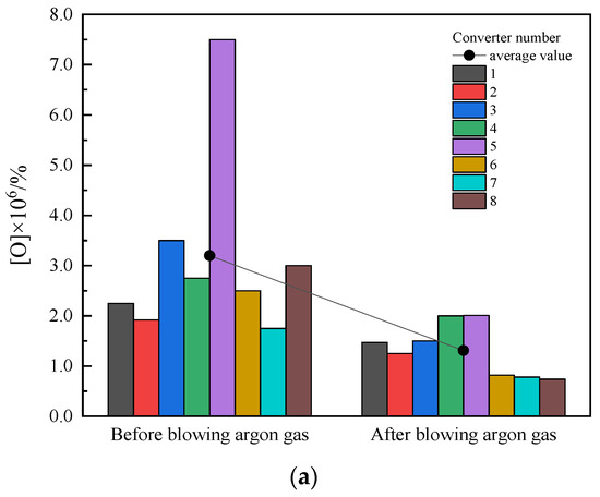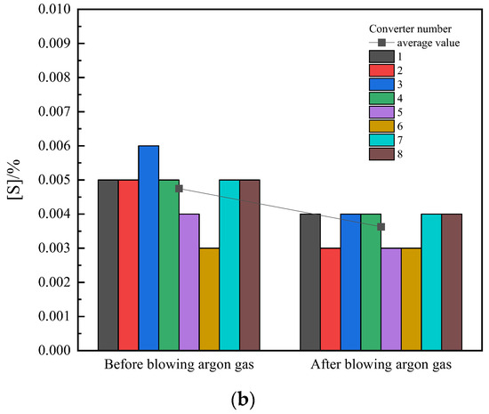 Figure 12 shows the changes in the content of [O] and [S] in the steel before and after composite argon blowing in the ladle. From the graph, it can be seen that the average free oxygen content in molten steel decreased from 3.2 × 10−6 to 1.3 × 10−6 before and after the experiment; the average sulfur content in molten steel decreased from 0.00475% to 0.0036%, with an average desulfurization rate of 22.3%.