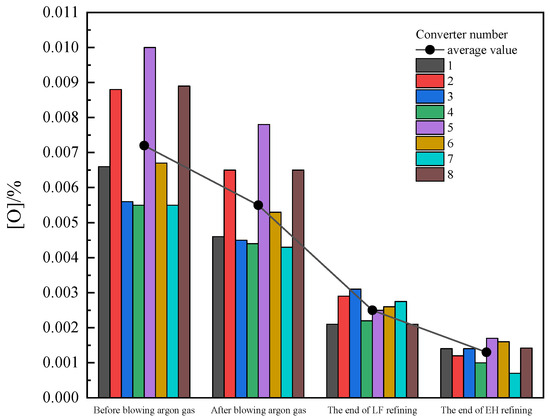 Figure 13 shows the variation in total oxygen content in molten steel from different sampling furnaces at each smelting station. The magnitude of the total oxygen content in steel represents the cleanliness of the molten steel. As shown in Figure 13, the total oxygen content in steel generally decreases with the increase in smelting process time. Before argon blowing, the average total oxygen content in the steel was 0.0073%. After the top and bottom of the ladle were blown again, the total oxygen content in the steel decreased to 0.0055%, and the average oxygen content decreased by 25%. After LF refining, the oxygen content in the steel was further reduced to 0.0025%. After RH refining, the total oxygen content in the steel finally decreased to around 0.0012%. Not only does it reduce the refining load of the LF furnace, but it is also beneficial in shortening the slag formation time of the LF furnace, accelerating the production rhythm, and ensuring the matching of the furnace and machine.