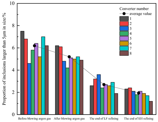 Larger oxide inclusions have a significant impact on the performance of steel grades. Figure 14 shows the variation in the proportion of inclusions larger than 5 μm in the molten steel. As shown in Figure 14, the average proportion of inclusions larger than 5 μm in the steel liquid before argon blowing is 6.2%. With the progress of the ladle top and bottom blowing process, the proportion of inclusions larger than 5 μm in the steel decreases to 5.2%. After LF and RH refining processes, the proportion of inclusions larger than 5 μm in the steel decreases to 1.93%. In terms of inclusion control, the top and bottom blowing technology of the ladle plays a bridging role in LF and RH refining.
