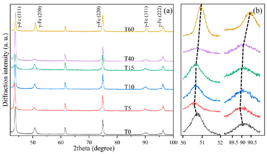 24]. Meanwhile, no new diffraction peaks were observed in the patterns of the shot-blasted samples compared to the heat-treated sample (T0), suggesting that no martensite, carbides, or other new phases formed during the process.