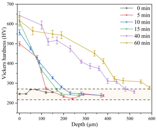 4]. However, extending the shot blasting time to 60 min resulted in a slight decrease in surface hardness. For all shot-blasted samples, the hardness gradually decreased with increasing distance from the surface, eventually converging to the level of the heat-treated sample. The hardened layer thickness, defined as the depth where the hardness matches that of the heat-treated sample, was measured to be 120, 200, 170, 480, and 600 μm for the 5, 10, 15, 40, and 60 min samples, respectively. Notably, the hardness gradient became progressively milder with longer shot blasting times. In summary, the results confirm that shot blasting successfully introduced a work-hardened layer on the high-manganese steel surface, with the layer depth increasing with processing time. The formation of this hardened layer is crucial for enhancing the materials’ wear resistance.
