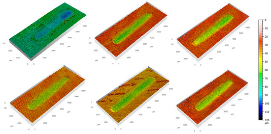 Figure 3 presents the 3D overall morphology of the wear scars on all tested specimens. It can be clearly seen that the wear scar width of the heat-treated sample (T0) is significantly larger than that of the shot-blasted samples. This is because after shot blasting, the surface hardness of the samples increases rapidly, which makes plastic deformation of the material surface difficult and prevents the counterpart ball from easily indenting the material surface. However, quantitative parameters such as wear depth cannot be directly obtained from these raw morphological images. For a quantitative comparison, the 3D morphology data were leveled using the unworn region of each sample as a reference plane. A comparative analysis of the processed wear scars is provided in