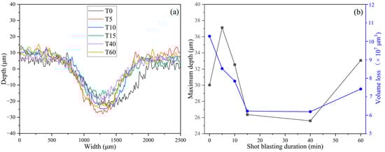 Figure 3. For the shot-blasted samples, the maximum depth decreased gradually with the extension of shot blasting time, reached the minimum value when the shot blasting time was 40 min, and then increased instead. The quantitative relationship between wear parameters and shot blasting duration is plotted in