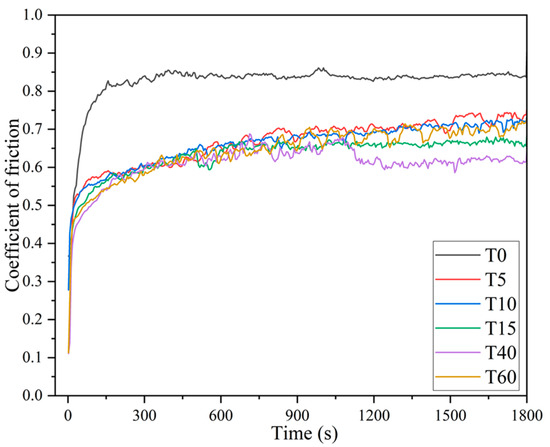 Figure 5 presents the evolution of the coefficient of friction (COF) for the test samples, which can be divided into three distinct stages. In the first stage, immediately after the test initiation, the COF of all samples increased rapidly with the number of cycles. In the second stage, the COF of the heat-treated sample (T0) increased rapidly to above 0.8 and fluctuated between 0.8 and 0.9. On the other hand, the COFs of the shot-blasted samples increased gradually, with all values remaining between 0.5 and 0.65. In the third stage, the COF of the T0 sample stabilized with slight fluctuations around 0.85. In contrast, the COF curves of the shot-blasted samples began to diverge: the T40 sample’s COF decreased and stabilized around 0.61, while the COFs of the other shot-blasted samples increased and exhibited larger fluctuations within the range of 0.65–0.75. Notably, after entering the stable stage, the COF of the heat-treated samples was significantly higher than that of the shot-blasted samples. This indicates that shot blasting has a significant impact on the surface state of the samples. This influence is attributed to the higher surface hardness of the shot-blasted samples, which suppresses excessive plastic deformation at the contact interface, and their lower surface roughness, which reduces frictional resistance.