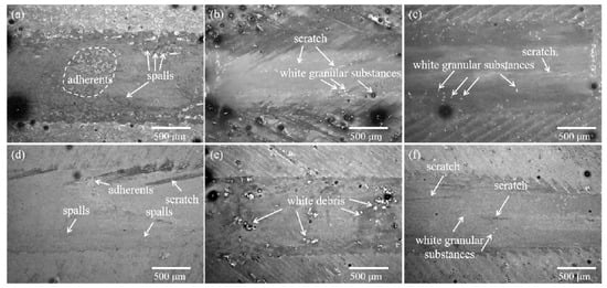 Figure 6a) is covered with light-colored irregular particles or patches. These features are likely wear products, such as debris from material detachment and transfer, or oxides formed by frictional heating. This morphology suggests that local adhesion and subsequent separation occurred during sliding. The presence of slight abrasive wear is also evident. Therefore, the primary wear mechanism for T0 is inferred to be adhesive wear, accompanied by minor abrasive and fatigue wear. In contrast, samples T5, T10, T15, and T60 exhibit regular rectangular (or nearly rectangular) wear marks. Their worn surfaces were relatively smooth, with only fine scratches and a small amount of wear debris, indicating that abrasive wear is the dominant mechanism with minimal adhesion. This shift from adhesive to abrasive wear as the dominant mechanism demonstrates how shot blasting modifies the wear behavior of high-manganese steel. The enhanced surface hardness from shot blasting makes plastic deformation of surface asperities more difficult, leading to a pronounced “plowing effect” during abrasion. This effect, combined with strong interatomic adhesion, accounts for the COF values observed in