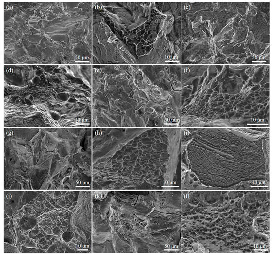 Figure 8k). Although some dimple-like structures persisted, they were highly heterogeneous in both size and shape. Widespread collapse and distortion of dimples were observed, with some regions being nearly devoid of these characteristic ductile features (