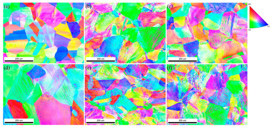 Figure 9 presents the EBSD inverse pole figure (IPF) maps of the tested samples. The T0 sample exhibits no significant deformation bands (