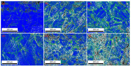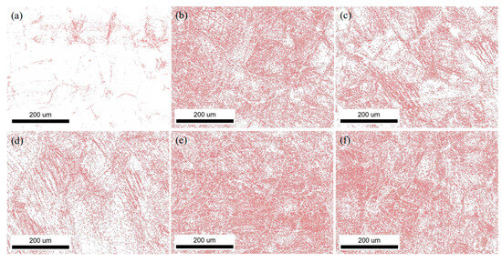 Figure 10 presents low-angle grain boundary (LAGB) maps of the samples subjected to different shot blasting durations, with boundaries of misorientation angles below 15° delineated by red lines. A substantial fraction of LAGBs is evident in all conditions. Quantitative data summarized in